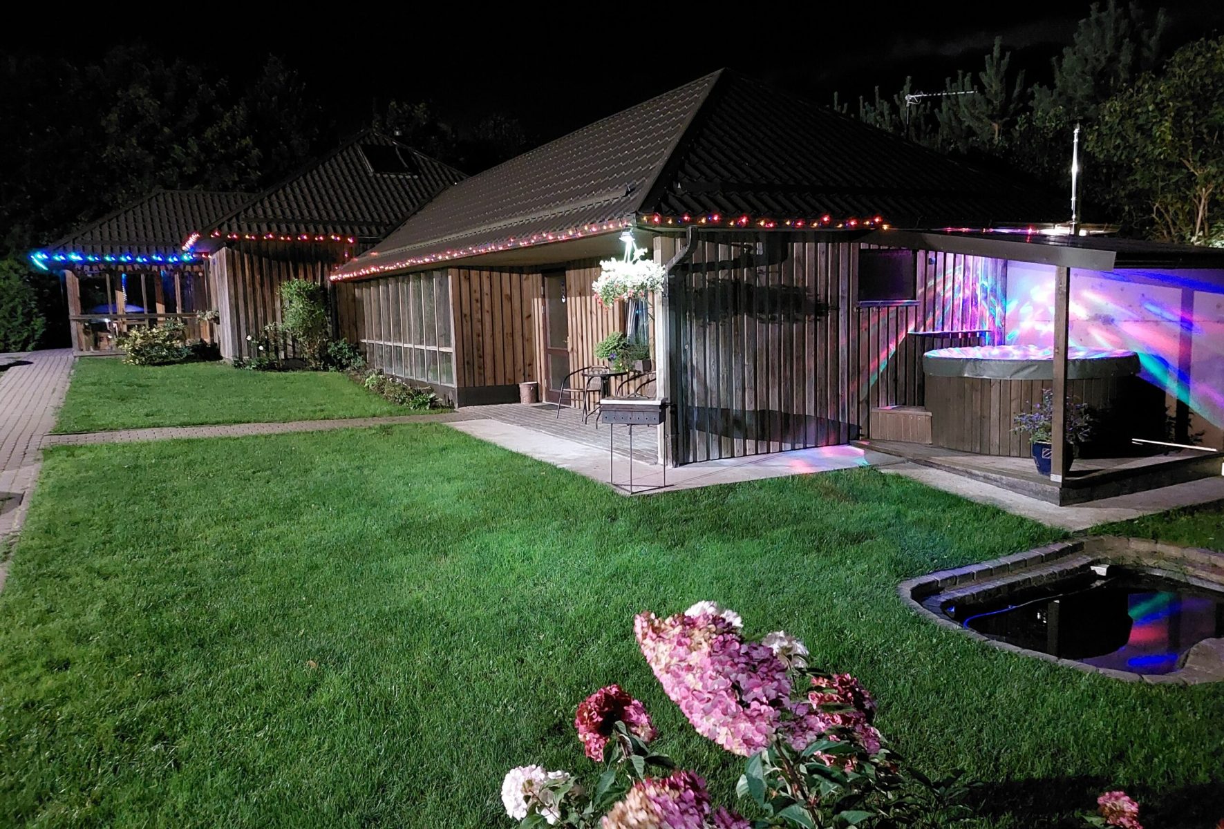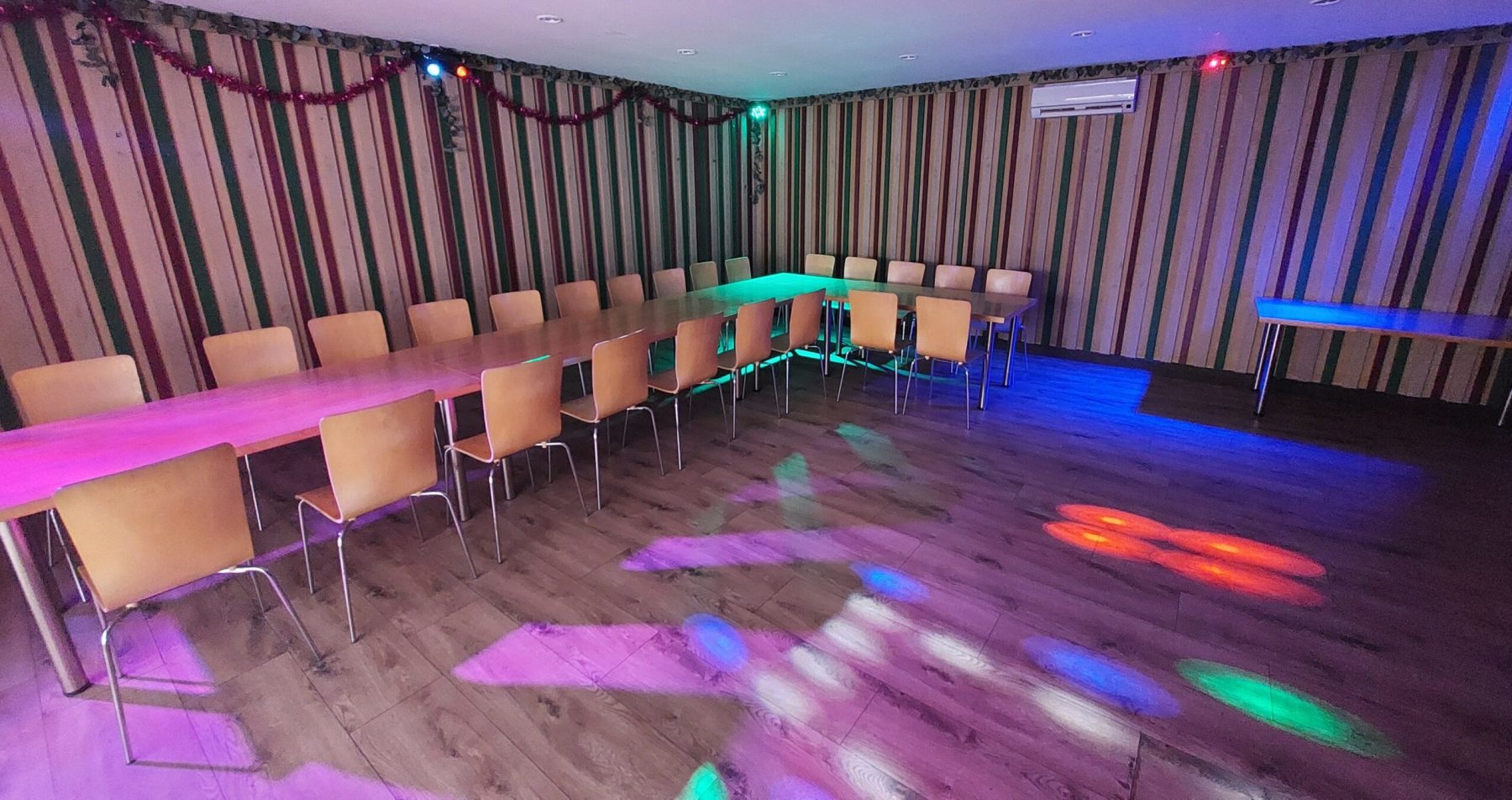 Stacionāra mūzikas aparatūra, gaismu efekti, kā arī projektors ar lielo ekrānu.